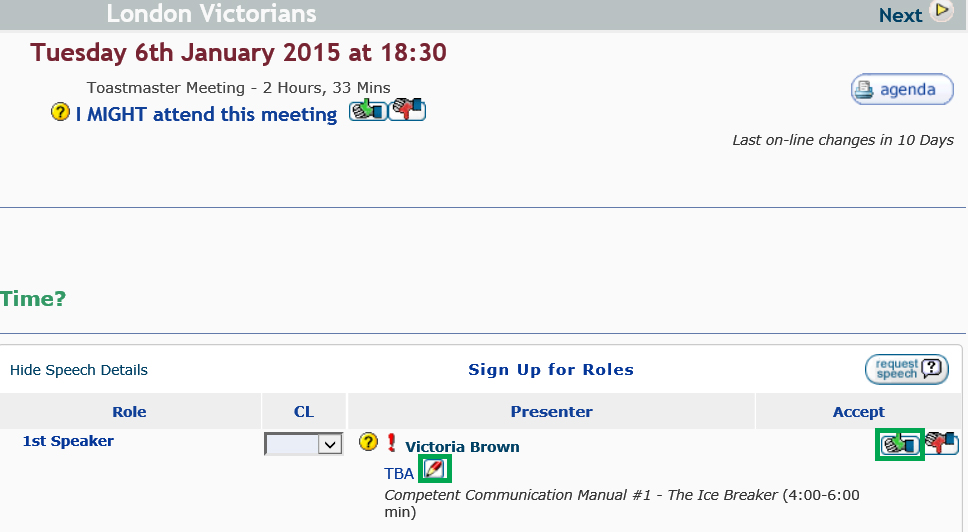 Should you need to add or amend the title of your speech before a meeting, you can do so by clicking on the pencil circled in green below which will pop up the ‘Speech Title’ tab. You can additionally formally accept the role of speaker for that speech by clicking on the green thumbs-up button.